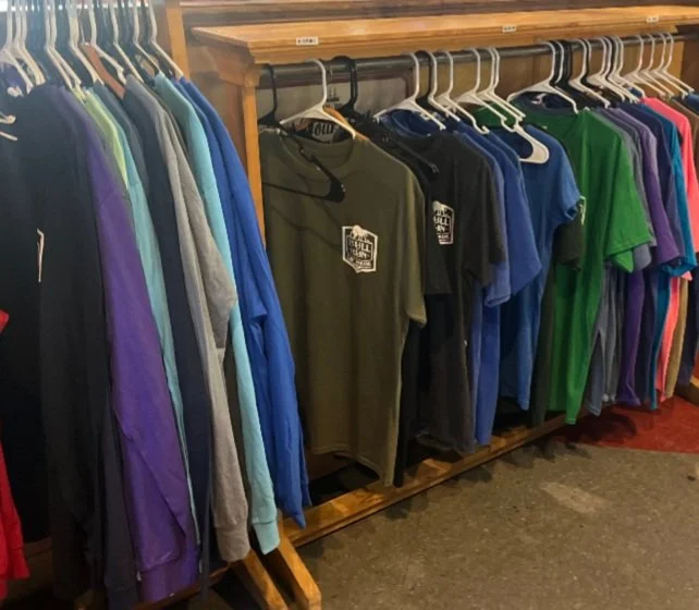We have sizes S M L XL XXL in Hoodies, Short and Long Sleeve t-Shirts. Offered in an array of colors and prints. All have the standard logo on the front left chest and a different design or logo on the back.